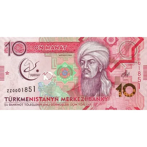 (Translation: Ten Manat, Central Bank of Turkmenistan, This banknote is valid for all types of payments)