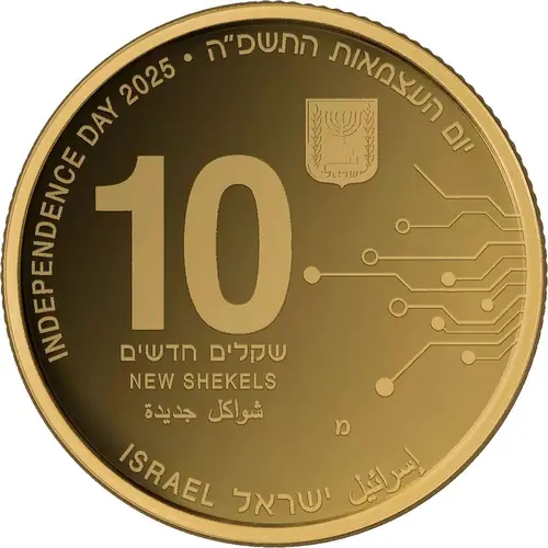 | Descrizione del dritto | The Israel State Emblem, `Israel` in English, Hebrew and Arabic, `Independence Day 2025` in English and Hebrew, face value and mint mark. To the right, circular and linear shapes symbolize Artificial Intelligence. |