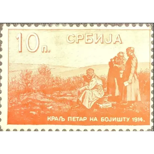 | Vorderseitenlegende | 10 П. СРБИЈА КРАЉ ПЕТАР НА БОЈИШТУ 1914. (Translation: Serbia King Peter on the battlefield 1914.) |