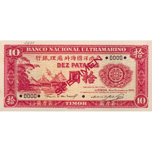| Obverse lettering | BANCO NACIONAL ULTRAMARINO DEZ PATACAS TIMOR Lisboa 16 de Novembro de 1945 |