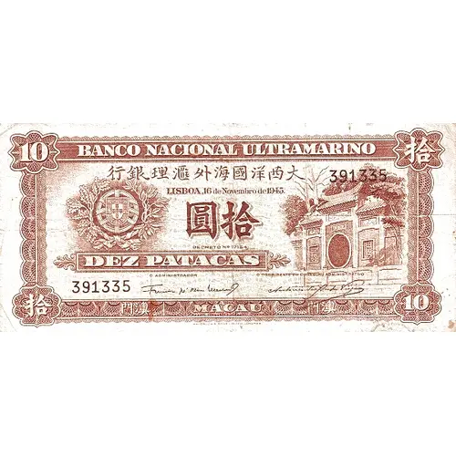 | 正面铭文 | BANCO NACIONAL ULTRAMARINO 行銀理滙外海國洋西大 LISBOA, 16 de Novembro de 1945. 圓拾 DECRETO № 17154 DEZ PATACAS O ADMINISTRADOR | O PRESIDENTE DE CONSELHO ADMINISTRATIVO 門澳 MACAU 門澳 |