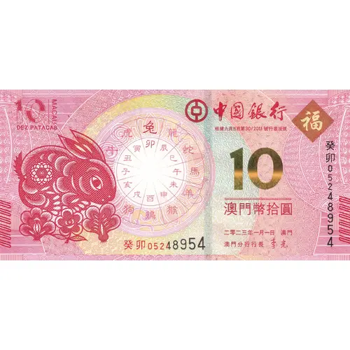 中國銀行 10 MACAU DEZ PATACAS 10 澳門幣拾圓 二零二三年一月一日 澳門 澳門分行總經理 (Translation: Bank of China Ten Macanese Patacas 2023 January 1 Macau Macau Branch General Manager) |
