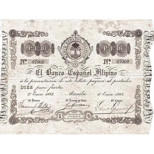 EL BANCO ESPAÑOL FILIPINO á la presentacion de este billete pagará al portador DIEZ PESOS FUERTE MANILA (Translation: The Spanish-Filipino Bank Upon presentation of this bill, will pay the bearer Ten hard pesos) |