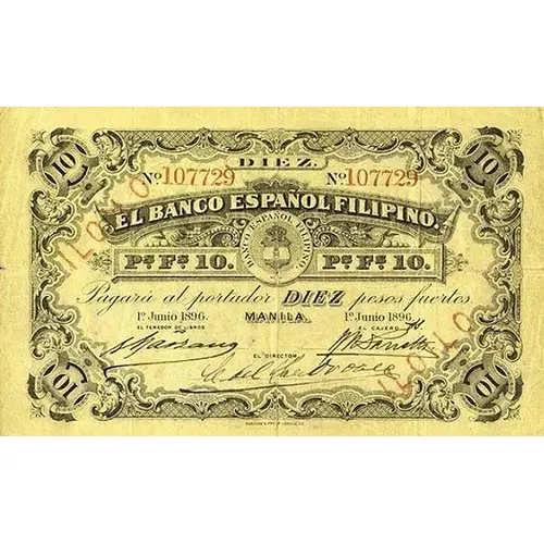 | Obverse lettering | EL BANCO ESPAÑOL FILIPINO á la presentacion de este billete pagará al portador DIEZ PESOS FUERTE MANILA (Translation: The Spanish-Filipino Bank Upon presentation of this bill, will pay the bearer Ten hard pesos) |