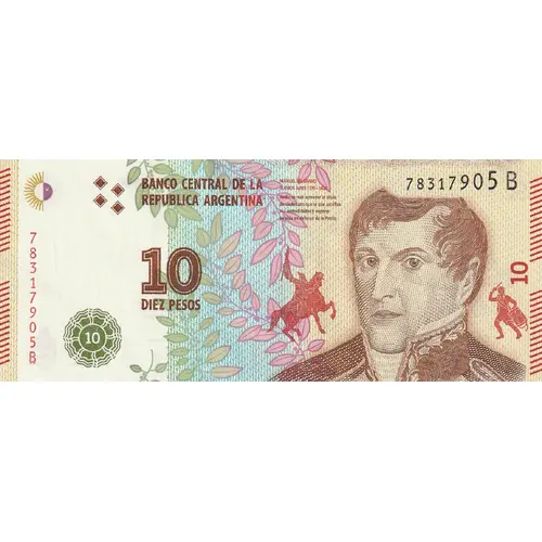 | Opschrift voorzijde | BANCO CENTRAL DE LA REPUBLICA ARGENTINA DIEZ PESOS Manuel Belgrano Buenos Aires 1770 - 1820 Nadie es más acreedor al título de ciudadano que el que sacrifica sus comodidades y expone su vida en defensa de la Patria. (Translation: Central Bank of the Argentine Republic Ten Pesos Manuel Belgrano Buenos Aires 1770 - 1820) No one deserves the title of citizen more than he who sacrifices his comforts and exposes his life in defense of the Fatherland.) |