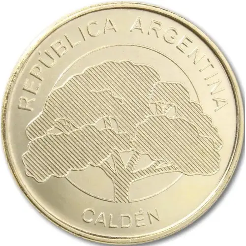 | Descrizione del dritto | In the central field, the stylized representation of the caldén, exclusive species of our country and owner of a characteristic broad and rounded glass; in the upper arch, the text `REPÚBLICA ARGENTINA` and in the lower one, `CALDÉN`, common name of the tree. |