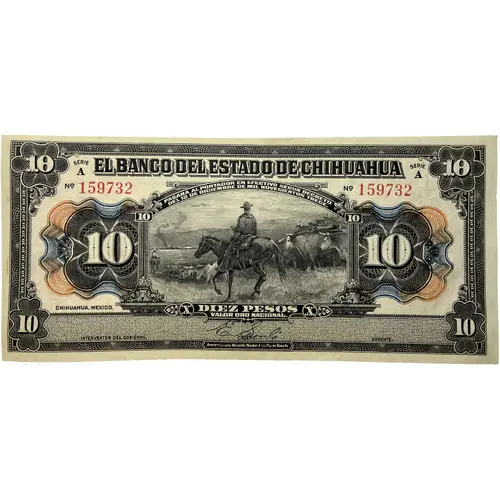 | Legenda do anverso | El Banco Del Estado De Chihuahua Pagara al portador en efectivo segun decreto del 12 de diciembre de mil novecientos trece. Diez Pesos Valor oro nacional (Translation: The State Bank of Chihuahua It will pay the bearer in cash according to the decree of December 12, one thousand nine hundred and thirteen. 10 Pesos National gold value) |