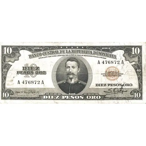 | Obverse lettering | Banco Central de la República Dominicana 10 Diez Pesos Oro Ciudad Trujillo - Distrito de Santo Domingo Diez Pesos Oro |