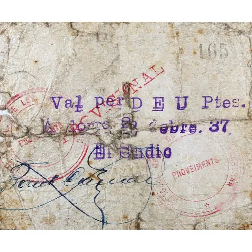 | 正面铭文 | Val per DEU Ptes. Andorra 22 debre. 37 El Sindic Provisional CONSELL GENERAL DE LES VALLS D`ANDORRA - PROVEÏMENTS (Translation: Voucher for Ten Pesetas Andorra, December 22, 1937 The `Sindic` Provisional General Council of the Valleys of Andorra - Supplies) |