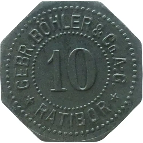 | Legenda do anverso | GEBR. BÖHLER & Co. A.-G. 10 RATIBOR |