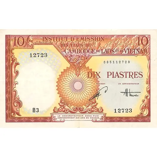 Ön yüz lejandı 10 INSTITUT D`EMISSION DES ETATS DU CAMBODGE DU LAOS ET DU VIETNAM 36941 039836941 DIX PIASTRES LE PRESIDENT UN ADMINISTRATEUR Z16 36941 LE CONTREFACTEUR SERA PUNI CONFORMEMENT AUX LOIS EN VIGUEUR