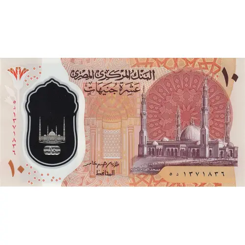 البنك المركزى المصرى ١٠ عشرة جنيهات ١٠ المحافظ مَسجِد الفَتّاح العَليم (Translation: Central Bank of Egypt 10 Ten Pounds 10 Al-Fatah al-Aleem mosque Governor) |