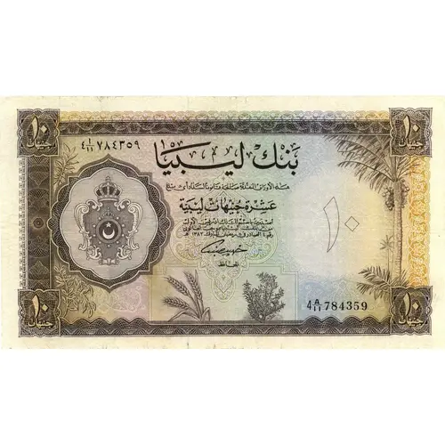 | 表面の銘文 | BANK OF LIBYA THESE CURRENCY NOTE ARE LEGAL TENDER FOR THE PAYMENT OF ANY AMOUNT TEN LYBIAN POUNDS ISSUED IN THE NAME OF KING IDRIS I BY THE BANK OF LIBYA IN ACCORDANCE WITH LAW NO.4 OF OF THE 5TH FEBRUARY 1963 |