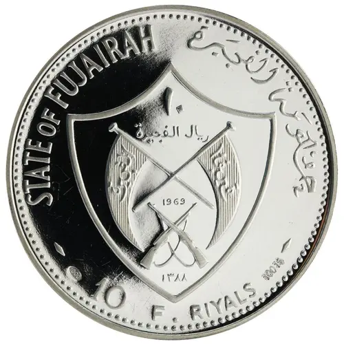 | Obverse lettering | STATE OF FUJAIRAH حُكومَة الفجَيرة ١٠ ريال الفجيرة الفجيرة الفجيرة 1969 ١٣٨٨ 807 - 10 F . RIYALS [1000] - (Translation: State of Fujairah 10 Fujairah Riyals Fujairah 1969 1388 807 10 F. Riyals [1000]) |