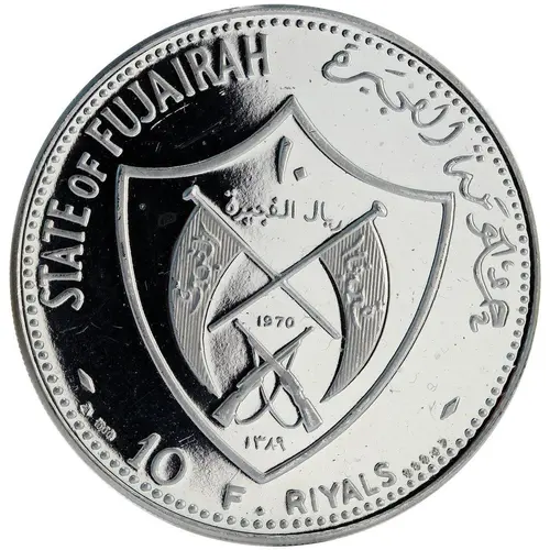 | 正面铭文 | STATE OF FUJAIRAH حُكومَة الفجَيرة ١٠ ريال الفجيرة الفجيرة الفجيرة 1970 ١٣٨٩ - 1000 10 F . RIYALS 11657 - (Translation: State of Fujairah 10 Fujairah Riyals Fujairah 1970 1389 1000 10 F. Riyals 11657) |