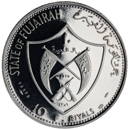 | 正面描述 | Coat of Arms. `Al Fujairah` in Arabic on both flags; normally on the left flag, and mirrored on the right flag. Mintage figure stamped at lower left, and silver fineness in oval at lower right |