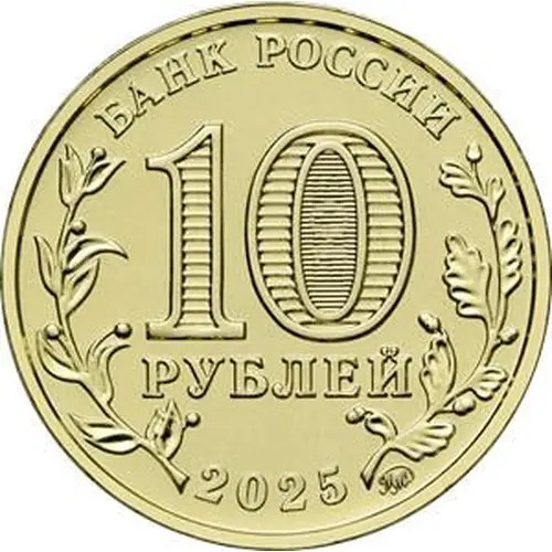 | توضیحات روی سکه | The obverse of the coin features the inscriptions around the circumference: ‘БАНК РОССИИ’ (BANK OF RUSSIA) at the top and ‘2025’ at the bottom. There are images of laurel and oak twigs on the left and right, respectively. The figure ‘10’ and the inscription ‘РУБЛЕЙ’ (ROUBLES) below denoting the face value of the coin are in the centre. The figure ‘0’ features a security element inside in the form of the figure ‘10’ and the inscription ‘РУБ’ (RUB) visible at various viewing angles to the coin surface. The Moscow Mint trademark is at the bottom. |