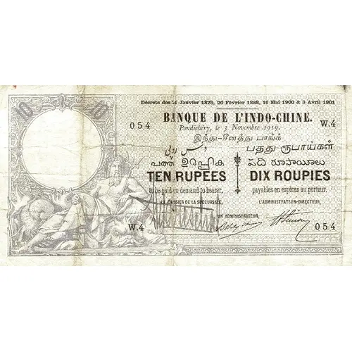 BANQUE DE L`INDOCHINE இந்து - சீனத்து பாங்க் DIX ROUPIES payables en especes au porteur TEN RUPEES to be paid on demand to bearer |