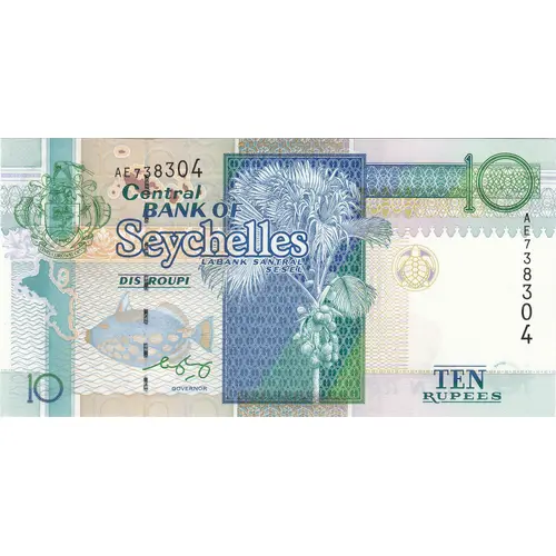 Central bank of Seychelles Labank santral sesel dis roupi Numéro de série ten rupees 10 Signature du gouverneur |
