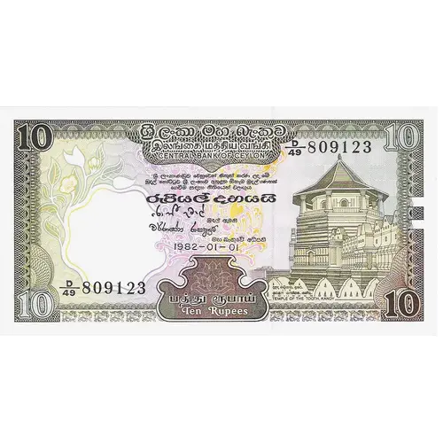 ශ්රී ලංකා මහ බැංකුව இலங்கை மத்திய வங்கி CENTRAL BANK OF CEYLON. ශ්රී ලංකාණ්ඩුව වෙනුවෙන් නිකුත් කරන ලද මේ මුදල් නෝට්ටුව ශ්රී ලංකාව ඇතුළත ඕනෑම මුදල් ගණනක් ගෙවිම සඳහා නිතියෙන් වලංගුය රුපියල් දහයයි මුදල් ඈමති මහ බැංකුවේ අධිපති ළදා මලිගා, නුවර. தலதா மாளிகை, கண்டி. TEMPLE OF THE TOOTH, KANDY பத்து ரூபாய் TEN RUPEES |