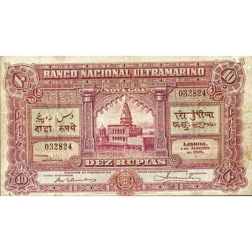 panel at Lettering: BANCO NACIONAL ULTRAMARINO NOVA GOA DEZ RUPIAS LISBOA, 1deJANEIROde1924 Reverse Picture of tiger at center Inscribed `BANCO NATIONAL` at top & `ULTRAMARINO` at bottom Watermark |