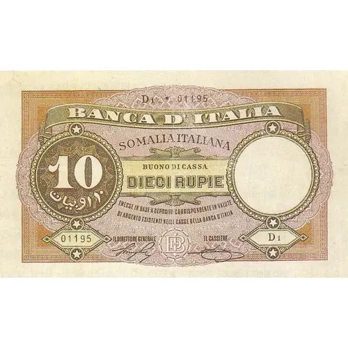 | Vorderseitenlegende | BANCA D`ITALIA SOMALIA ITALIANA BUONO DI CASSA DIECI RUPIE EMESSE IN BASE A DEPOSITO CORRISPONDENTE IN VALUTE DI ARGENTO ESISTENTI NELLE CASSE DELLA BANCA D`ITALIA |