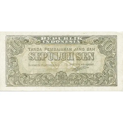 REPUBLIK INDONESIA TANDA PEMBAJARAN JANG SAH SEPULUH SEN DJAKARTA 17 OKTOBER 1945 MENTERI KEUANGAN |