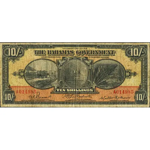 10/- THE CURRENCY NOTE ACT 1919 THE BAHAMAS GOVERNMENT HEREBY PROMISES TO PAY TO THE BEARER ON DEMAND TEN SHILLINGS SIGILLUM PROVIDENTIA C^ETERARUMQUE BAHAMA INSULARVM EXPULSIS PIRATIS RESTITUTA COMMERCIA TEN 10 COLONIAL SECRETARY, COMMISSIONER OF CURRENCY. RECEIVER GENERAL, COMMISSIONER OF CURRENCY. COMMISSIONER OF CURRENCY (Translation: Seal of Providence and other Bahamas Islands. Pirates expelled, commerce restored.) |
