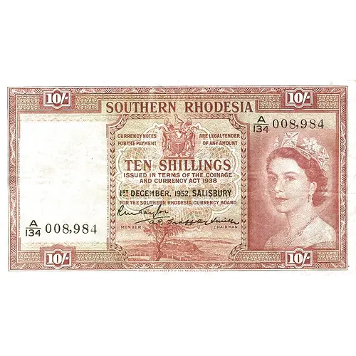 | 表面の銘文 | SOUTHERN RHODESIA CURRENCY NOTES ARE LEGAL TENDER FOR THE PAYMENT OF ANY AMOUNT TEN SHILLINGS ISSUED IN TERMS OF THE COINAGE AND CURRENCY ACT 1938 FOR THE SOUTHERN THODESIA CURRENCY BOARD |