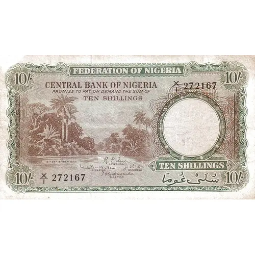 | Opschrift voorzijde | Federation of Nigeria Central Bank of Nigeria Promise to pay on demand the sum of Ten Shillings |