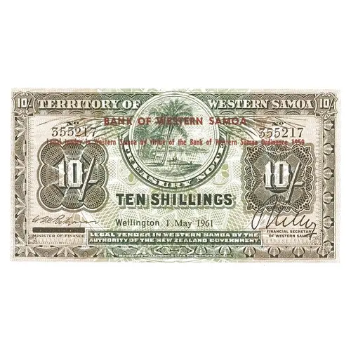 | Légende du revers | TERRITORY OF BANK OF WESTERN SAMOA 10/- TREASURY NOTE WESTERN SAMOA Legal tender in Western Samoa by virtue of the Bank of Western Samoa Ordinance 1959 TEN SHILLINGS |
