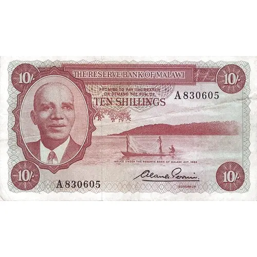 THE RESERVE BANK OF MALAWI PROMISE TO PAY THE BEARER ON DEMAND THE SUM OF TEN SHILLINGS ISSUED UNDER THE RESERVE BANK OF MALAWI ACT. 1964 |