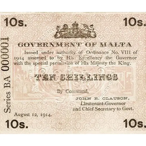 10s. 10s. GOVERNMENT OF MALTA Issued under authority of Ordinance No. VIII of 1914 assented to by His Excellency the Governor with the special permission of His Majesty the King. TEN SHILLINGS By Command, JOHN E. CLAUSON, Lieutenant-Governor and Chief Secretary to Govt. August 12, 1914. 10s. 10s. |