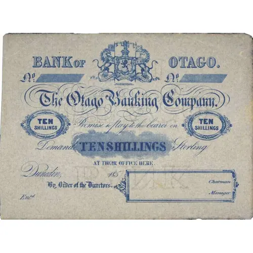 BANK OF OTAGO THE OTAGO BANKING COMPANY TEN SHILLINGS TEN SHILLINGS WE PROMISE TO PAY TO THE BEARER ON DEMAND TEN SHILLINGS STERLING AT THEIR OFFICE HERE DUNEDIN BY ORDER OF THE DIRECTORS |