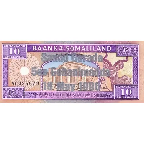 | Opis líce | BANKAA SOMALILAND LABAATAN SL SHILIN SOMALILAND 10 SHILLINGS ٢٠شن Sanad Gurada 5ee Gobanjmadda 18 May 1996 (Translation: Bank of Somaliland Ten Somaliland Shillings. 5th Anniversary of Independence 18 May 1996) |