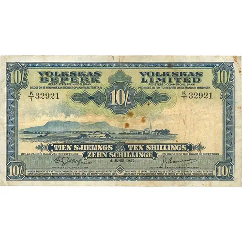 VOLKSKAS BEPERK GEREGISTREERDE HANDELSBANK BELOOF OM TE WINDHOEK AAN TOONDER OP ANVRAAG TE BETAAL VOLKSKAS LIMITED REGISTERED COMMERCIAL BANK PROMISES TO PAY TO BEARER ON DEMAND AT WINDHOEK 10/- TIEN SJIELINGS TEN SHILLINGS ZEHN SCHILLINGE 4 JUNIE 1952 |