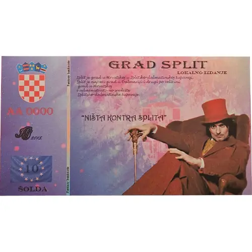 | نوشتههای روی اسکناس | AA 0000 2015. 10 ŠOLDA Fantasy banknote Fantasy banknote GRAD SPLIT LOKALNO IZDANJE Split je grad u Hrvatskoj u Splitsko-dalmatinskoj županiji ASPlit je največi grad u Dalmaciji i drugi po veličini grad u Hrvatskoj Vadministrativno središte Splitsko-dalmatinske županije `NIŠTA KONTRA SPLITA` |