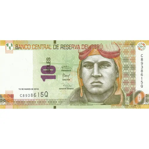 | Obverse lettering | BANCO CENTRAL DE RESERVA DEL PERÚ 10 SOLES 10 DE MARZO DE 2016 JOSE ABELARDO QUIÑONES GONZALEZ (Translation: Central Reserve Bank of Peru 10 Soles March 10th., 2016 José Abelardo Quiñones González) |