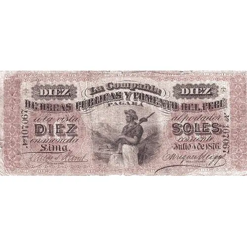 | Légende de l’avers | DIEZ La Compañía DIEZ DE OBRAS PÚBLICAS Y FOMENTO DEL PERÚ PAGARÁ a la vista al portador DIEZ SOLES en moneda corriente Lima, Julio 4 de 1876 (Translation: Ten The Company of Public Works and Development of Perú will pay at sight to the bearer ten Soles in regular currency. Lima, July 4th., 1876.) |
