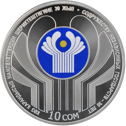 | Obverse lettering | КӨЗ КАРАНДЫСЫЗ МАМЛЕКЕТТЕРДИН ШЕРИКТЕШТИГИНЕ 30 ЖЫЛ • СОДРУЖЕСТВУ НЕЗАВИСИМЫХ ГОСУДАРСТВ - 30 ЛЕТ 10 СОМ (Translation: 30 years of the Commonwealth of Independent States) |