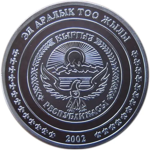 | Legenda awersu | ЭЛ АРАЛЫК ТОО ЖЫЛЫ КЫРГЫЗ РЕСПУБЛИКАСЫ 2002 (Translation: International Year of Mountains, Kyrgyz Republic) |