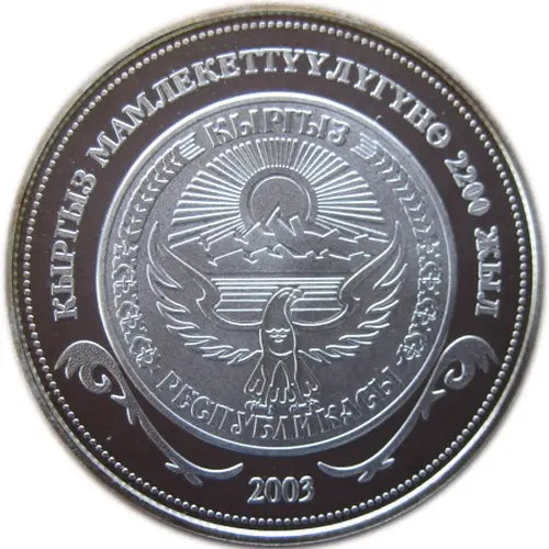 | Obverse lettering | КЫРГЫЗ МАМЛЕКЕТТҮҮЛҮГҮНӨ 2200 ЖЫЛ КЫРГЫЗ РЕСПУБЛИКАСЫ 2003 (Translation: 2200 years of Kyrgyz statehood, Kyrgyz Republic) |