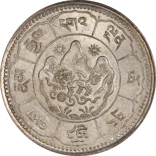 | Légende du revers | འདུ་ དགོད་ བདེ་སྐྱིད་ འདོད་རྒུ་ འཁྱིལ་བ་ རབ་བྱུང་ བཅུ་ དྲུག་ལོ་ ལོ་ ཉེར་བཞི་ དངུལ་སྲང་ བཅུ་ (Translation: `du dgod bde skyid `dod rgu `khyil ba / rab byung bcu / drug lo nyer bzhi / dngul srang bcu Affairs, happiness, objects of desire, turning around / Cycle sixteen / Year twenty-four / Ten silver Srang) |