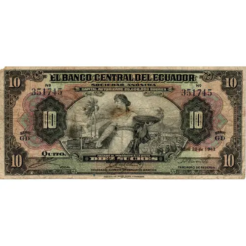 | Obverse lettering | EL BANCO CENTRAL DEL ECUADOR SOCIEDAD ANÓNIMA CAPITAL AUTORIZADO 20.000.000 SUCRES Quito, Abril 20 de 1943 PAGARÁ AL PORTADOR A LA VISTA DIEZ SUCRES (Translation: The Central Bank of Ecuador. Anonymous Society. Authorized capital 20 000 000 Sucres Quito, April 20th., 1943 Will pay to the bearer 10 Sucres) |