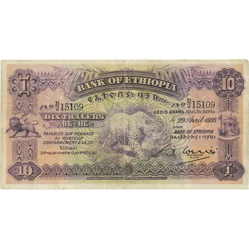 | Légende de l’avers | BANK OF ETHIOPIA የኢትዮጵያ፡ባንክ። DIX THALERS አስር፡ብር። PAYABLES SUR DEMAND AU PORTEUR CONFORMEMENT A LA LOI (Translation: Bank of Ethiopia Ten Birr) |