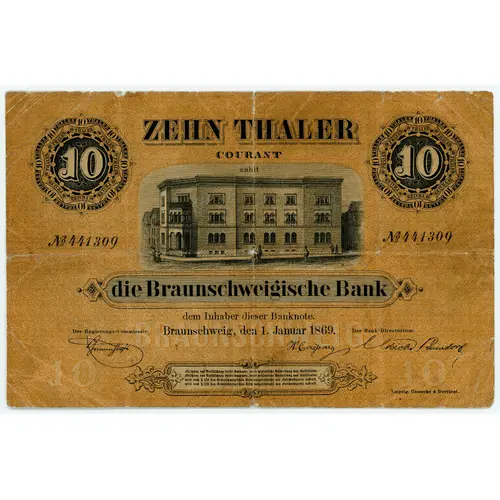 10 10 ZEHN THALER COURANT zahlt die Braunschweigische Bank dem Inhaber dieser Banknote. Braunschweig, den 1. Januar 1869. Der Regierungs-Commissair: Das Bank-Directorium: Leipzig, Giesecke & Devrient. |