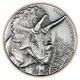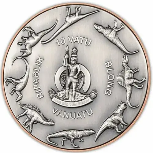 The arms of Vanuatu featuring a Melanesian warrior standing in front of a curved boar`s tooth above a scroll reading `LONG GOD YUMI STANAP`, denomination above, within a ring of different dinosaurs. |