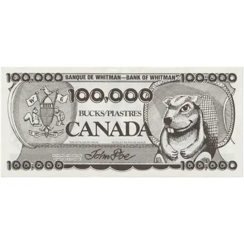 | Obverse lettering | BANQUE DE WHITMAN -- BANK OF WHITMAN 100,000 BUCKS/PIASTRES CANADA THIS NOTE HAS NO VALUE CE BILLET N`A PAS DE VALEUR AUTHORIZED SIGNATURE John Doe SIGNATURE AUTORISÉE |