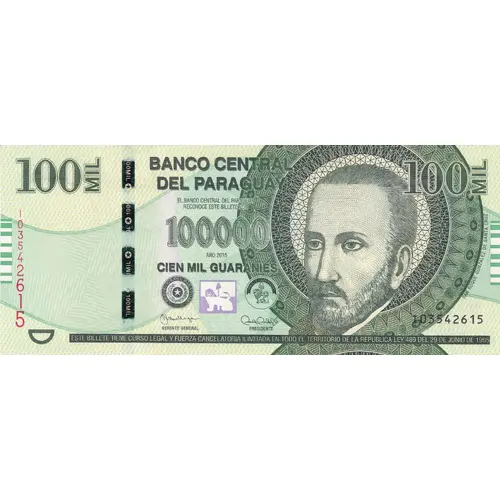 | Légende de l’avers | 100MIL 100MIL BANCO CENTRAL DEL PARAGUAY EL BANCO CENTRAL DEL PARAGUAY RECONOCE ESTE BILLETE POR 100000 AÑO 2015 CIEN MIL GUARANIES REPUBLICA DEL PARAGUAY PAZ Y JUSTICIA SAN ROQUE GONZALEZ DE SANTA CRUZ ESTE BILLETE TIENE CURSO LEGAL Y FUERZA CANCELATORIA ILIMITADA EN TODO EL TERRITORIO DE LA REPUBLICA (LEY 489 DEL 29 DE JUNIO DE 1995). (Translation: 100 Thousands Central Bank of Paraguay The Central Bank of Paraguay accepts this banknote for Year 2015 One Hundred Thousand Guaranies Republic of Paraguay Peace and Justice Saint Roque Gonzalez de Santa Cruz (Saint Cross) This banknote is legal tender, and unlimited valid on ll the Republic territory (Law # 489 from June 29th., 1995).) |