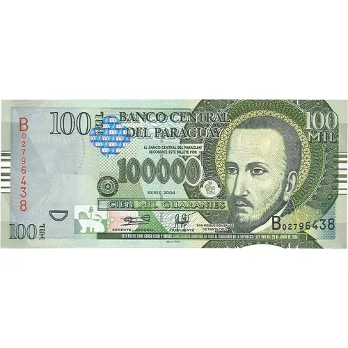 | Obverse lettering | 100MIL 100MIL BANCO CENTRAL DEL PARAGUAY EL BANCO CENTRAL DEL PARAGUAY RECONOCE ESTE BILLETE POR 100000 SERIE 2004 CIEN MIL GUARANIES REPUBLICA DEL PARAGUAY PAZ Y JUSTICIA SAN ROQUE GONZALEZ DE SANTA CRUZ ESTE BILLETE TIENE CURSO LEGAL Y FUERZA CANCELATORIA ILIMITADA EN TODO EL TERRITORIO DE LA REPUBLICA (LEY 489 DEL 29 DE JUNIO DE 1995). (Translation: 100 Thousands Central Bank of Paraguay The Central Bank of Paraguay accepts this banknote for 100,000 Series 2004 One Hundred Thousand Guaranies Republic of Paraguay Peace and Justice Saint Roque Gonzalez de Santa Cruz (Saint Cross) This banknote is legal tender, and unlimited valid on ll the Republic territory (Law # 489 from June 29th., 1995).) |